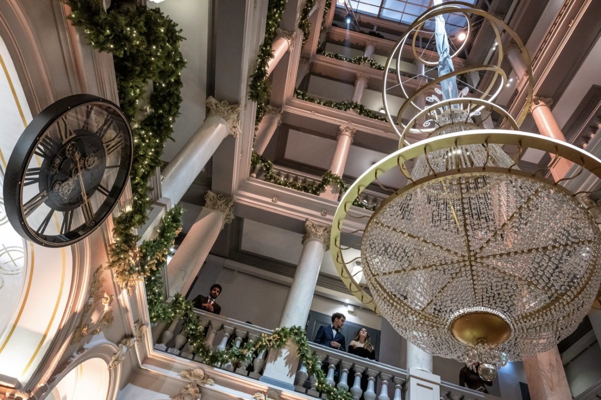 Depuis les étages, les invités observent la scène : un ballet de balustrades, de guirlandes et de lustres cristallins où le temps semble suspendu (c) DR