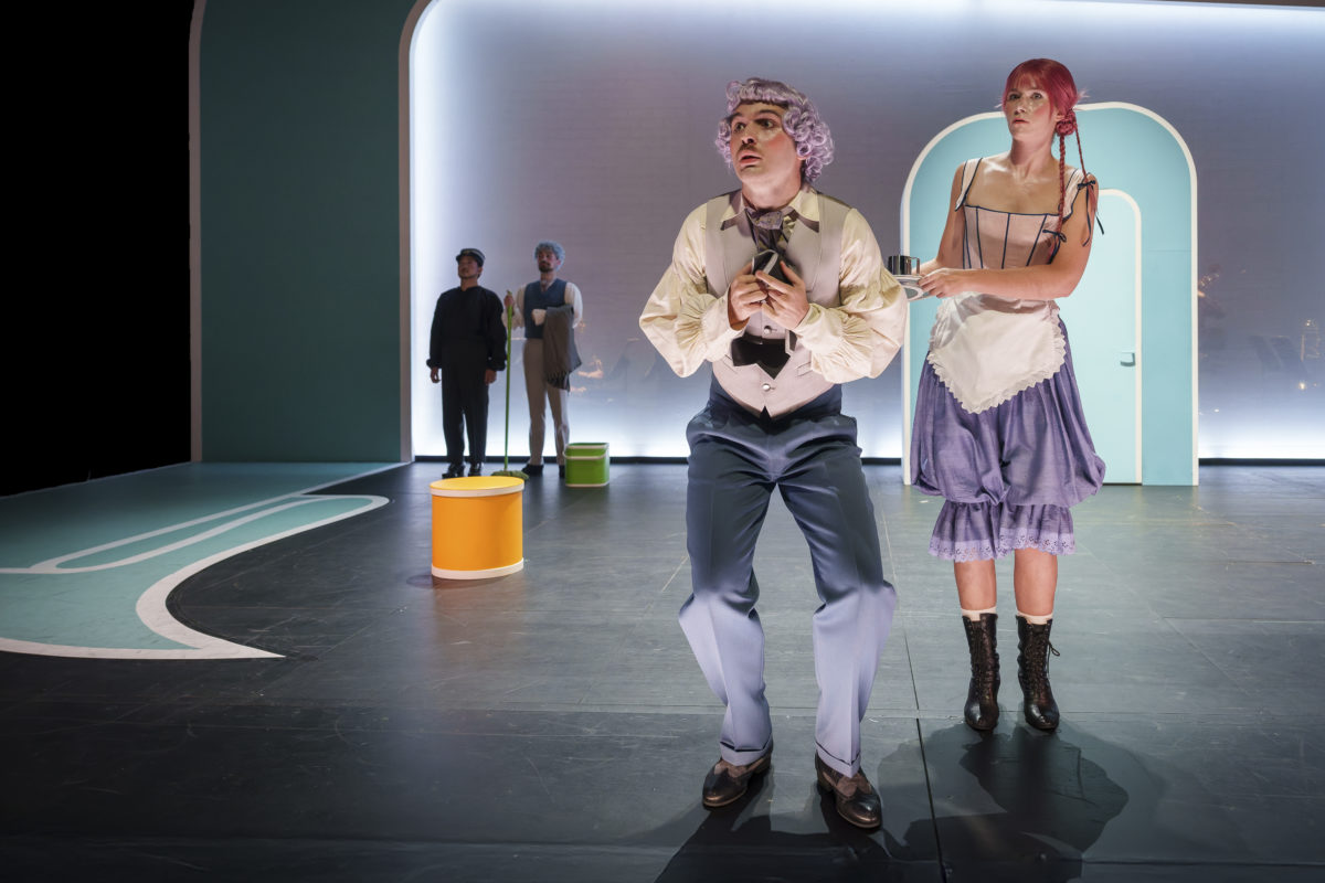 Sur scène ensuite, la taille n’empêche pas le plaisir. Malgré une aire de jeu réduite –un cadre, une porte, des dégagements minuscules– les interprètes conduits par Tilman aus demSiepen déploient un jeu très rythmé, aux gestes précis et drôles, soulignant des malentendus ou l’obséquiosité de courtisans. Et ça commence dès le début : le panneau des surtitres mal réglé –trop bas, puis trop haut– les paroles censées aider le public qui défilent de plus en plus rapidement, clin d’œil à la signature musicale de Rossini, connu pour ses partitions à progression rythmique exponentielle. Mention spéciale pour ce décor d’Oscar Mateo Grunert, plein d’inventions malgré un cadre restreint.