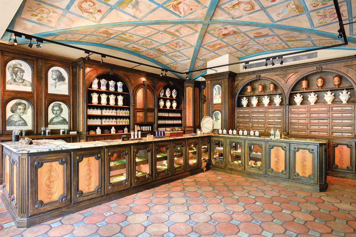 Sous ses voûtes peintes et ses armoires d’apothicaire, l’Officine Universelle Buly réenchante le rituel du soin. Entre flacons en verre, bocaux d’herboriste et portraits renaissants, chaque boutique s’apparente à un cabinet d’alchimie où l’art dialogue avec la beauté (c) DR
