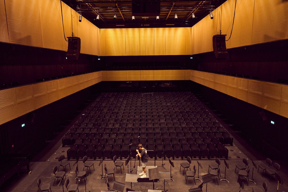 L’entrée passée, les espaces publics en béton ciré, coiffés de plafond en miroir, en double-hauteur, sont généreux. A cette première impression minérale succède une atmosphère chaleureuse, dans la salle de concert, aux coloris dorés du laiton et teintes noires du bois lasuré. Ici, point de vignoble, mais un parallélépipède, une Shoebox. Un concept moderne ?Pas vraiment, puisqu’on le retrouve notamment dans la Goldene Saal de la Musikverein à Vienne. L’innovation, c’est la salle dans une boîte, une structure à double-peau afin d’éviter les vibrations des trains passant juste à côté. A l’image du 2M2C à Montreux et du l’élégant KKL de Lucerne, l’élégante salle de 550 places sert également pour des congrès. Un regret, le nom NODA BCVS, ou quand le sponsor finit par prendre une place qui n’est pas la sienne, dans une stratégie de « naming » autocentré.