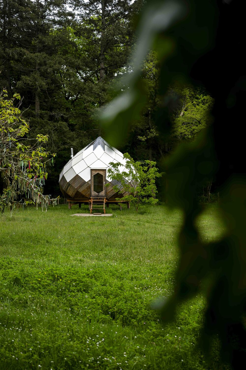 Cabane comme un cocon géométrique posé au milieu des clairières : ici, l’architecture murmure à l’oreille de la forêt (c) Géraldine Martens