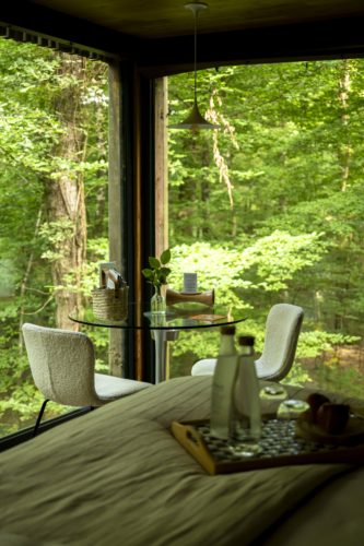 De vastes baies vitrées remplacent les murs : la forêt devient tableau, les branches deviennent rideaux, le ciel devient plafond. Ici, l’architecture se fait discrète, presque diplomate. Elle négocie avec les arbres, se glisse entre les troncs et laisse la nature écrire la mise en scène. Dormir dans ces cabanes, c’est retrouver la poésie primitive de l’enfance mais avec une terrasse panoramique, une baignoire avec vue sur les feuilles et un design affûté comme une plume de héron.