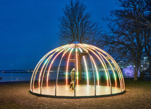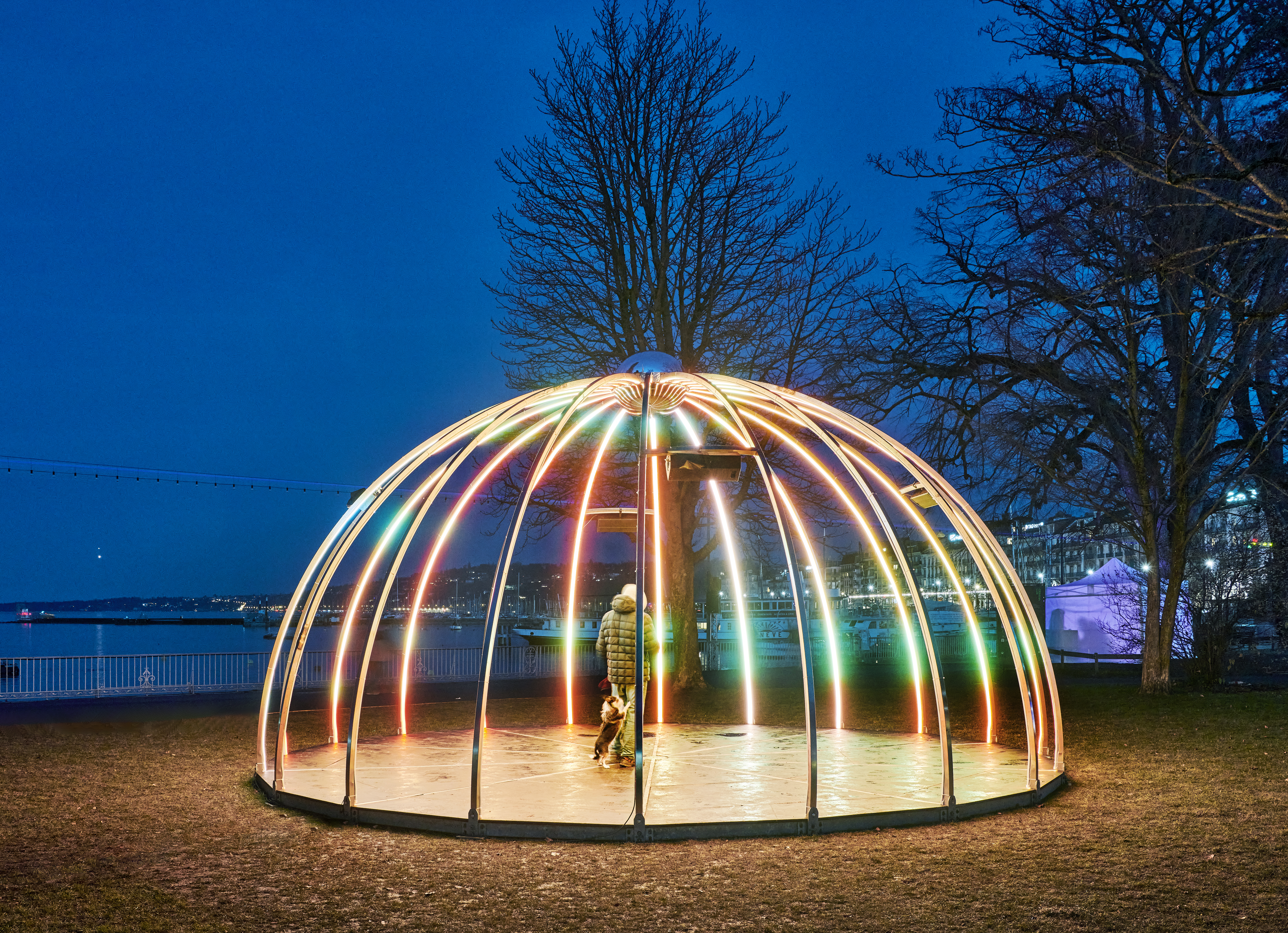Toujours au Jardin Anglais, Polaris de Structurals & Owelle agit comme un champ gravitationnel. Un dôme lumineux aux arches convergentes, attirant le regard vers un noyau incandescent. On s’approche. On entre. On se laisse absorber.