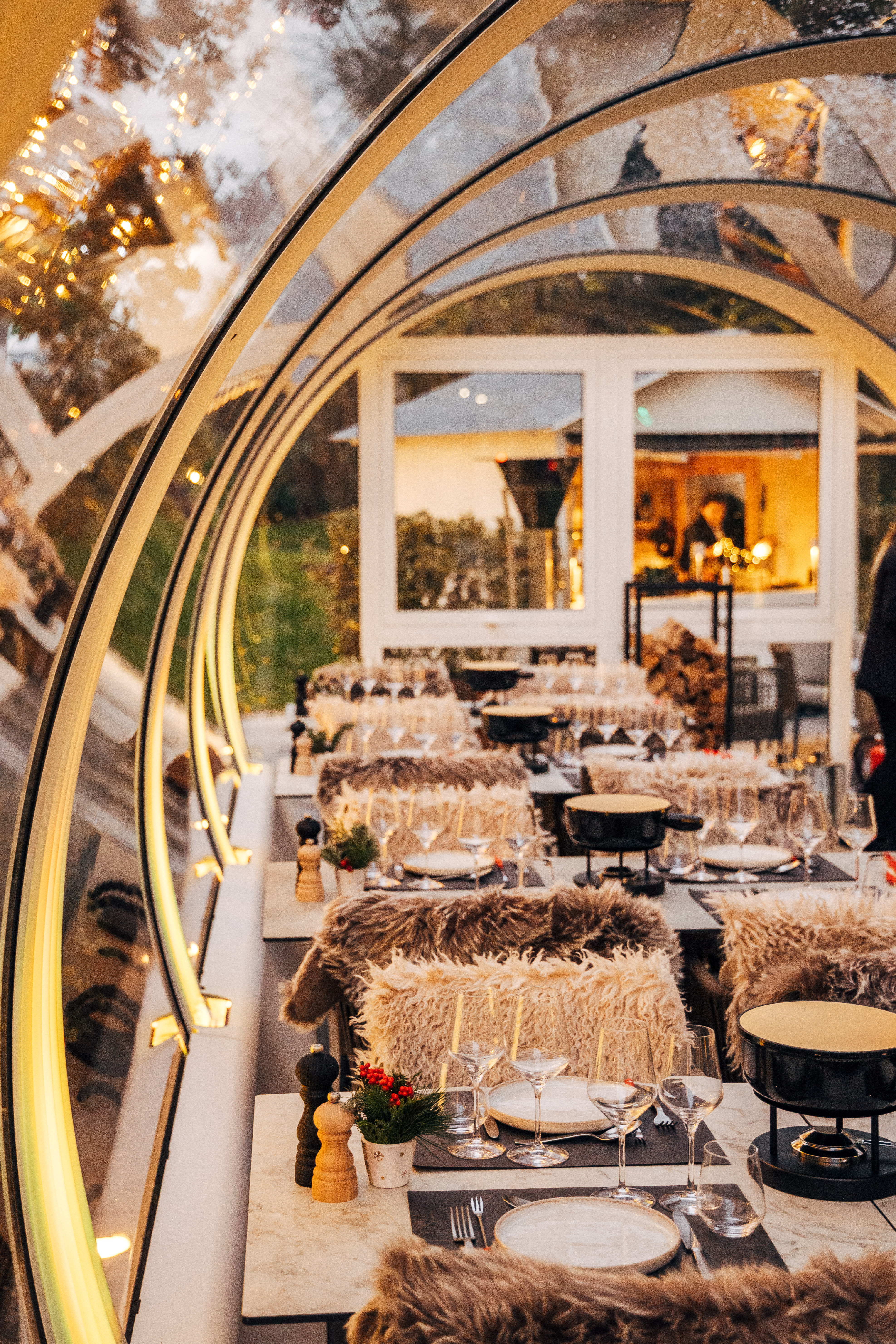 Dîner sous cloche, conversations à ciel ouvert. À l’intérieur, le temps ralentit. À l’extérieur, l’hiver attend (C) DR