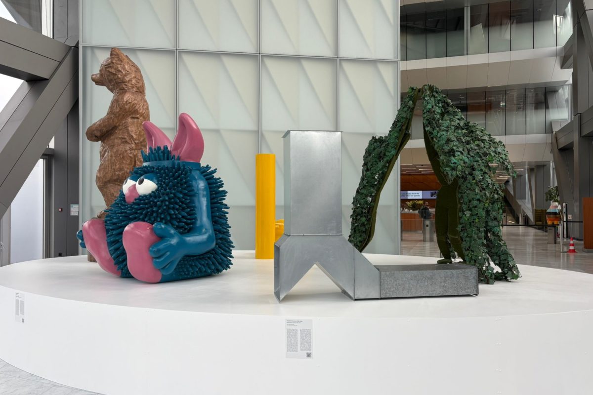 Sous la verrière du siège JTI, cinq sculptures du MAMCO dialoguent entre acier et lumière. Un hall devenu respiration artistique entre ours aveugle, jouet XXL et structures modulaires, l’art se faufile dans le quotidien corporate (c) DR