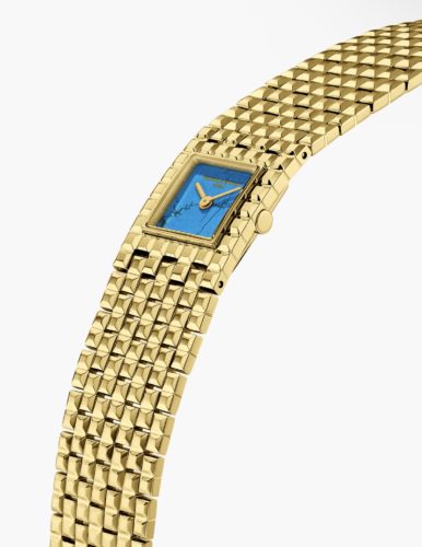 Première montée en tension : l’or s’avance, solaire, presque insolent. La lumière ne l’effleure pas, elle s’y accroche. Au centre, un cadran turquoise, minéral, indompté — chaque pièce unique, comme si la matière refusait toute discipline. Le motif clou de Paris martèle la surface, cadence la peau, imprime le rythme. Ici, les minutes ne défilent pas : elles vibrent. Elles s’entrechoquent, elles brillent, elles s’assument.