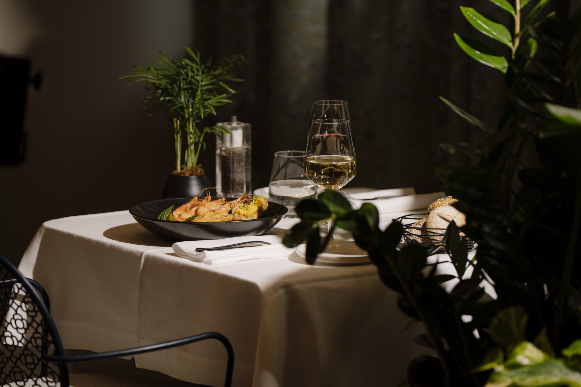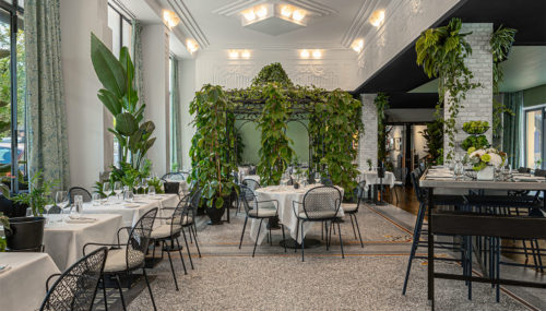 Dans la salle transformée en serre botanique, les rideaux en toile de Jouy semblent respirer, le kiosque en fer forgé fait office de portail vers un ailleurs, et les plantes dansent comme si le bassin extérieur soufflait encore un peu d’été. C’est un décor qui glisse, qui murmure, qui floute la frontière entre rêve et réalité. Le mobilier de jardin devient écrin, l’ambiance sonore une invitation au dépaysement. On n’est plus dans un restaurant : on est dans une halte onirique où l’on prend le temps… d’oublier le temps!