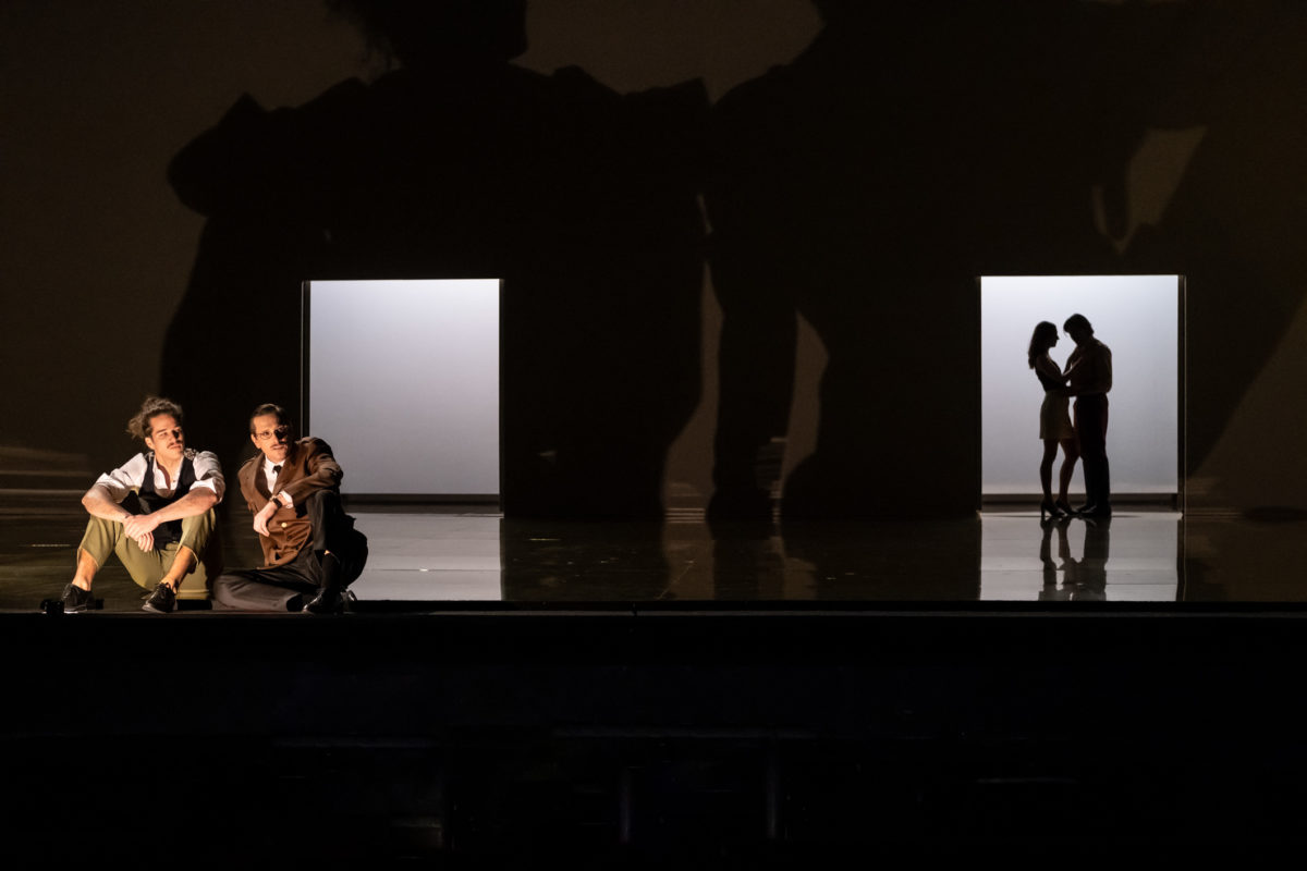 C’est là que le bât blesse : la mise en scène paraît bien prévisible. Si Ted Huffman s’inspire de « l’Italie méditerranéenne du milieu du XXe siècle : un monde où violence et raffinement cohabitent », on est déçu du propos –ou son absence– sur la violence faite aux femmes. Dans la proposition de l’artiste New-yorkais, Otello apparaît violent mais surtout comme une victime manipulée par un Iagocharismatique. Au lieu de questionner le « crime passionnel » propre à de nombreux féminicides, au lieu d’offrir une lecture qui complète un argument éculé –la femme victime, acceptant un destin injuste mais qui pardonne. On aurait pu espérer autre chose, un regard déconstruit sur la masculinité toxique. Si le thème est parfois passé au chausse-pied du spectacle vivant, il aurait ici toute sa pertinence. En revanche, on peut saluer le jeu des protagonistes, incarné, travaillé, propre à créer une proximité. Ainsi chaque membre du chœur est actif etsollicité. Par ailleurs, le dispositif scénique permet de basculer parfaitement des moments intimes aux grands tableauxd’ensemble.