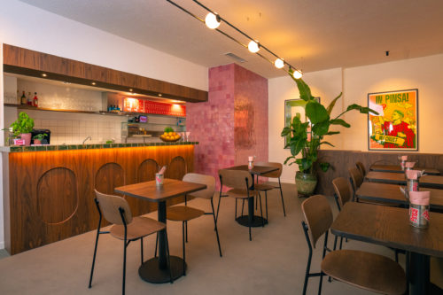 Ici, tout s’arrondit comme la pâte qu’on célèbre : l’ovale est le fil rouge. Tables, chaises et mobilier en épousent la forme, comme si l’espace lui-même s’était laissé étirer. Au cœur du décor, un comptoir et un mur de zellige signés Salima Filali, qui dépoussière l’art marocain pour le faire vibrer version contemporaine : éclats graphiques, reflets scintillants, dialogue subtil entre Rome, Marrakech et Genève. Mention spéciale: les toilettes, un cocon rose bonbon qui se métamorphose, une fois la porte fermée, en scène animée par la panthère rose elle-même – humour et décalage en prime! Autre clin d’œil, celui du branding signé The Workshop : une identité aussi soignée qu’un tailleur italien, qui transforme chaque box en accessoire de style.