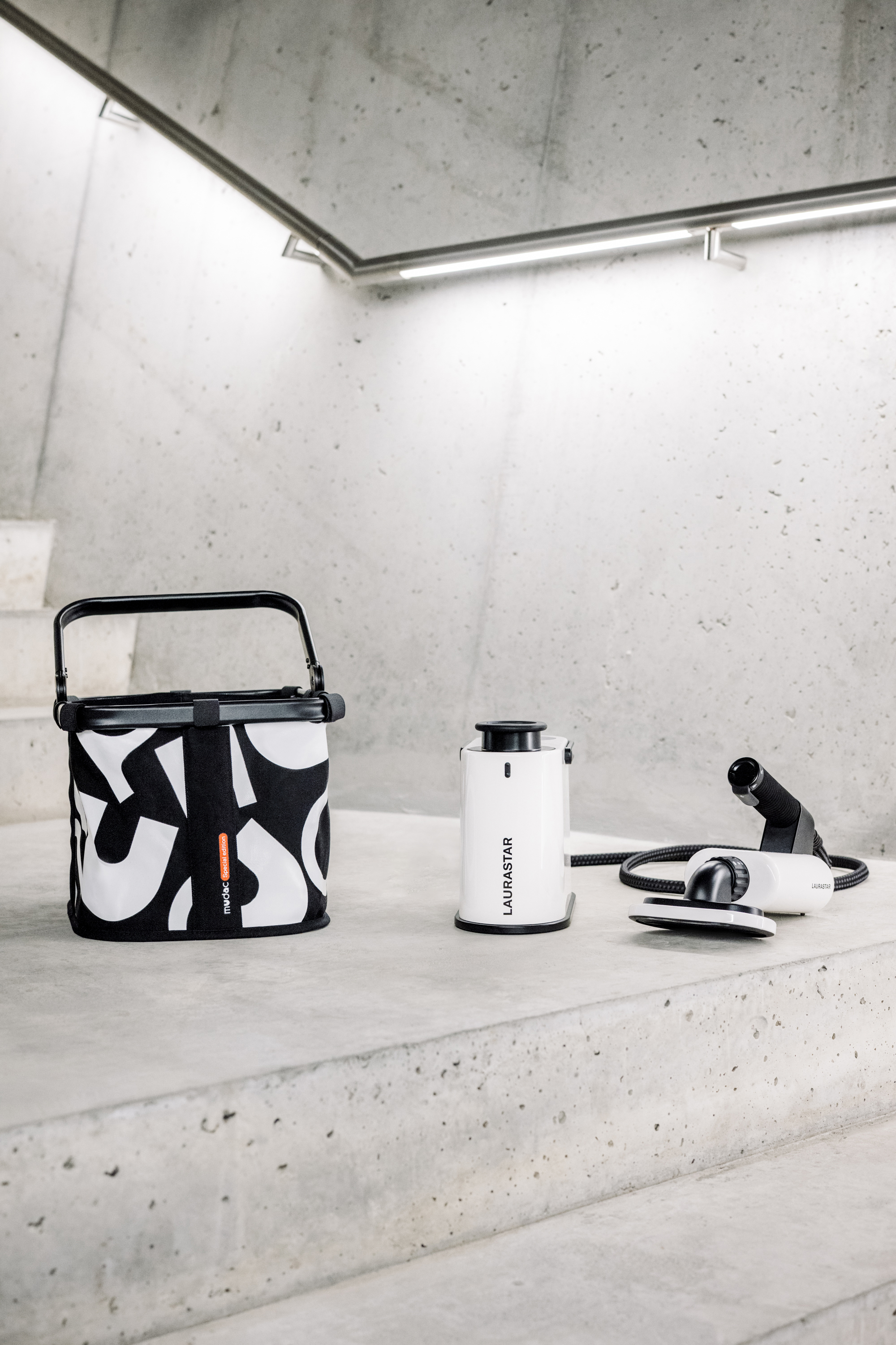 Dans ce duo helvétique, la technologie ne fait pas cavalier seul : elle dialogue avec la forme, l’histoire et le regard. Laurastar, maître de la vapeur depuis plus de 45 ans, détourne son savoir-faire vers un nouvel horizon — purifier la maison sans chimie — pendant que le mudac lui offre un écrin conceptuel, presque muséal. Résultat ? Un panier AURA réinterprété comme manifeste graphique, noir et blanc, signé Chi-Long Trieu, qui joue la partition du minimalisme avec une précision presque typographique. Derrière l’objet, une idée plus large : réhabiliter le geste domestique en expérience design, où chaque détail — du souffle invisible à la ligne visible — affirme qu’ici, même l’utile a du style.